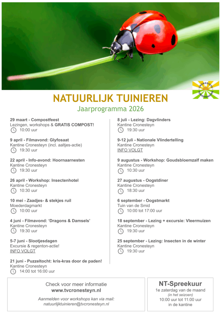 Elk jaar organiseren we een serie leuke, leerzame en praktische activiteiten voor onze leden. Alle activiteiten hebben op hun eigen manier iets te maken met Natuurlijk Tuinieren: van workshops waarbij je zelf aan de slag gaat tot lezingen en excursies waarin we samen de natuur beter leren kennen — er is voor ieder wat wils!